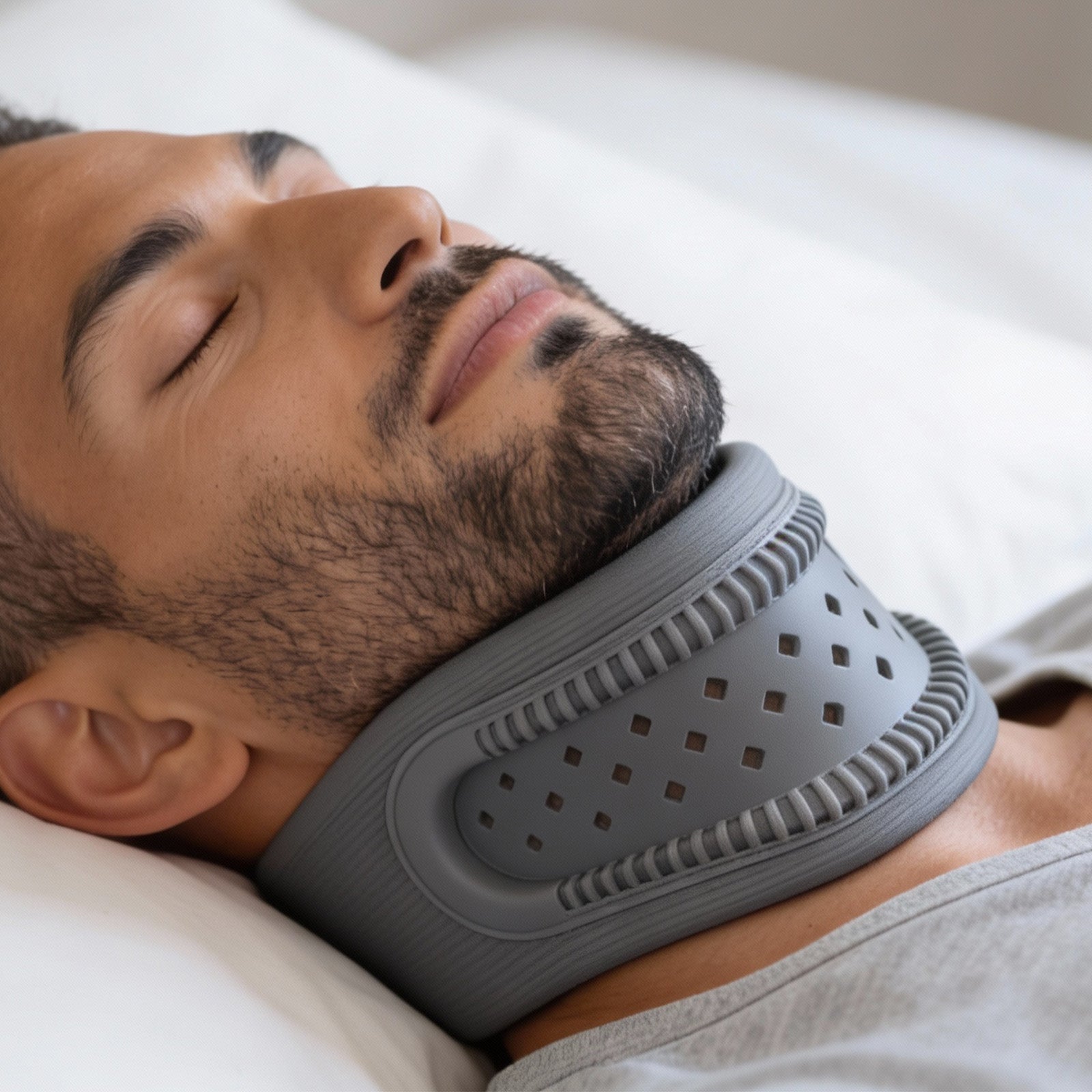 visastar MundFix ist eine ergonomische Hals-Nackenstütze, die den Mund sanft geschlossen hält, ohne Druck, ohne Technik und ohne Eingriff in den Mundraum. Für eine natürliche Schlafposition, entspannte Nächte und spürbar mehr Erholung.